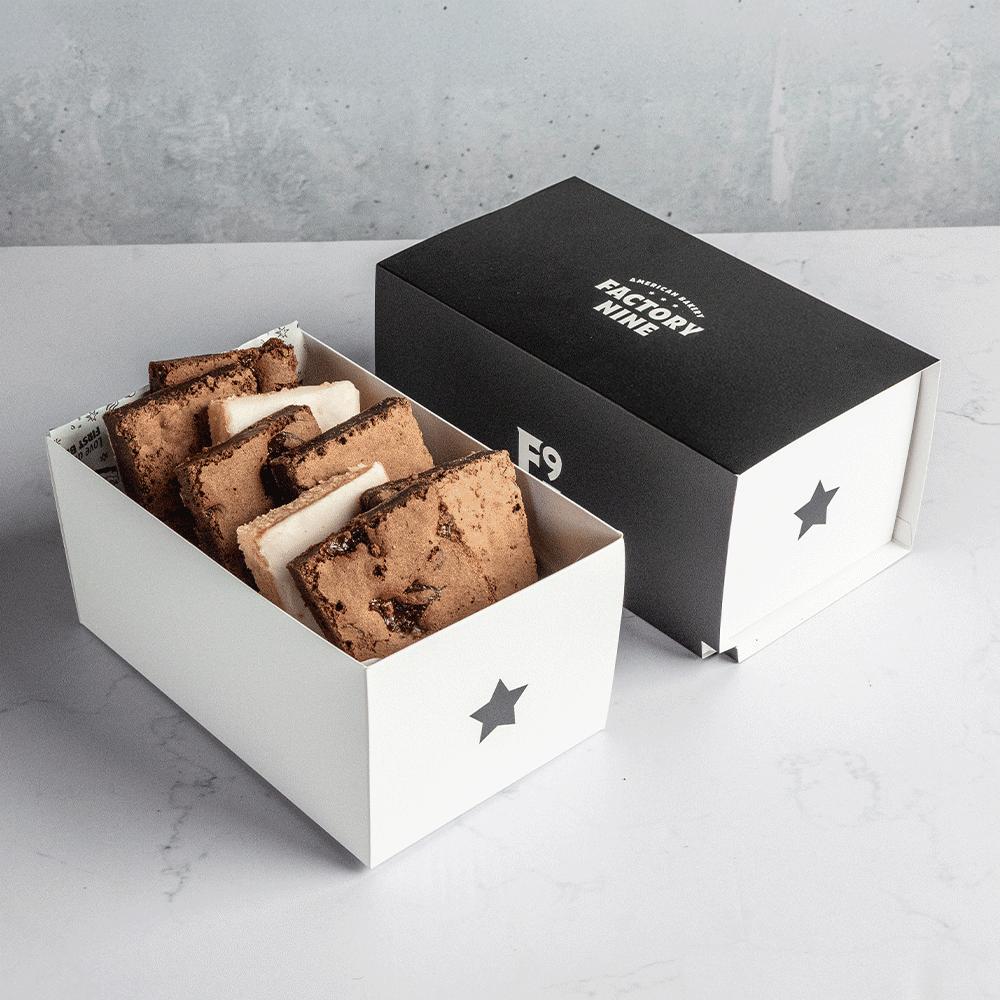 Caja ideal para regalo con mix de 8 brownies a elección: Brownie dulce de leche, brownie húmedo tradicional y/o brownie Lemonie.