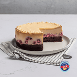 Base de brownie relleno de cheesecake con chocolate blanco y frambuesas. Decorado con ganache y trocitos de chocolate blanco. Medidas formatos: Mediano 16 cm para 8 a 10 personas. Grande 22 cm para 18 a 20 personas.