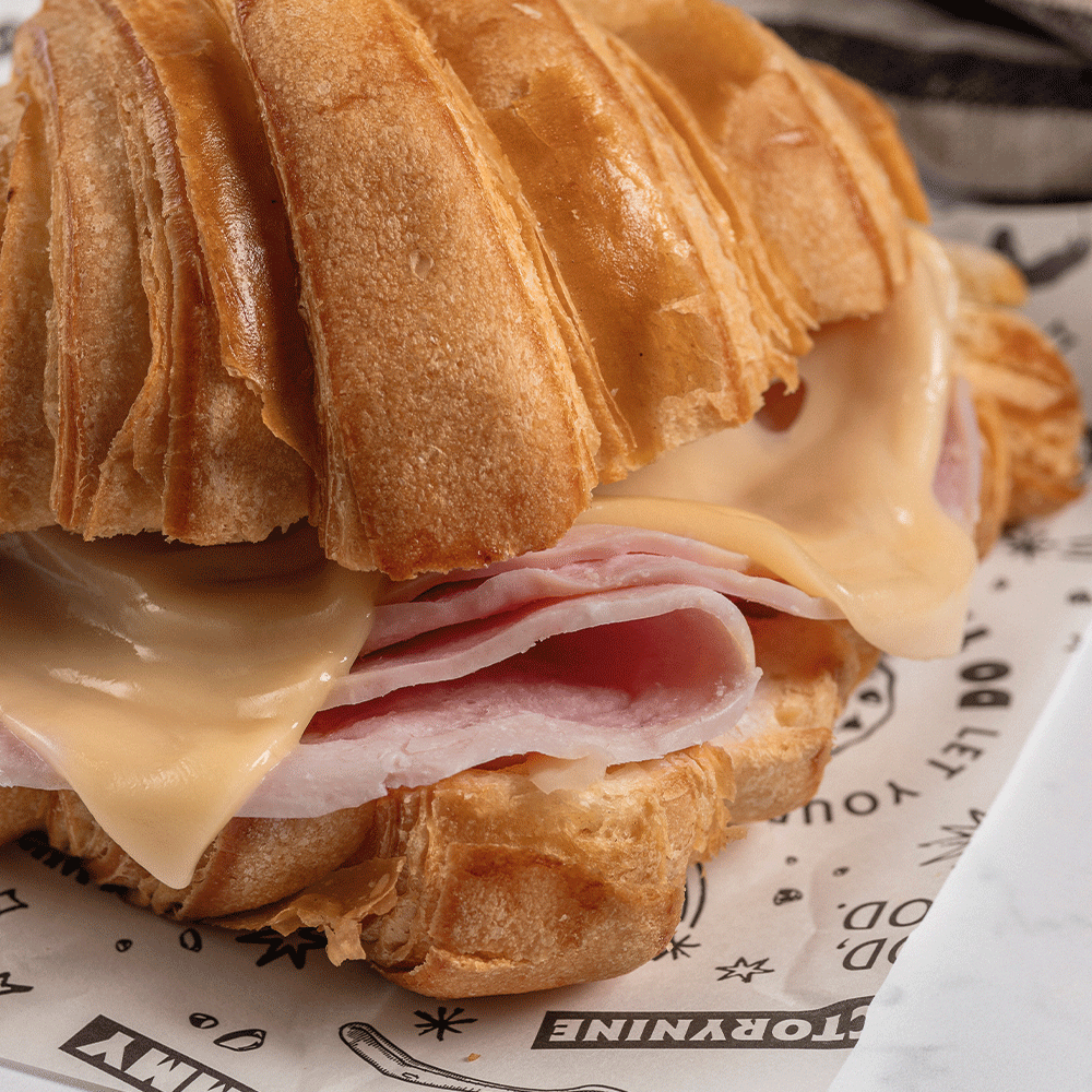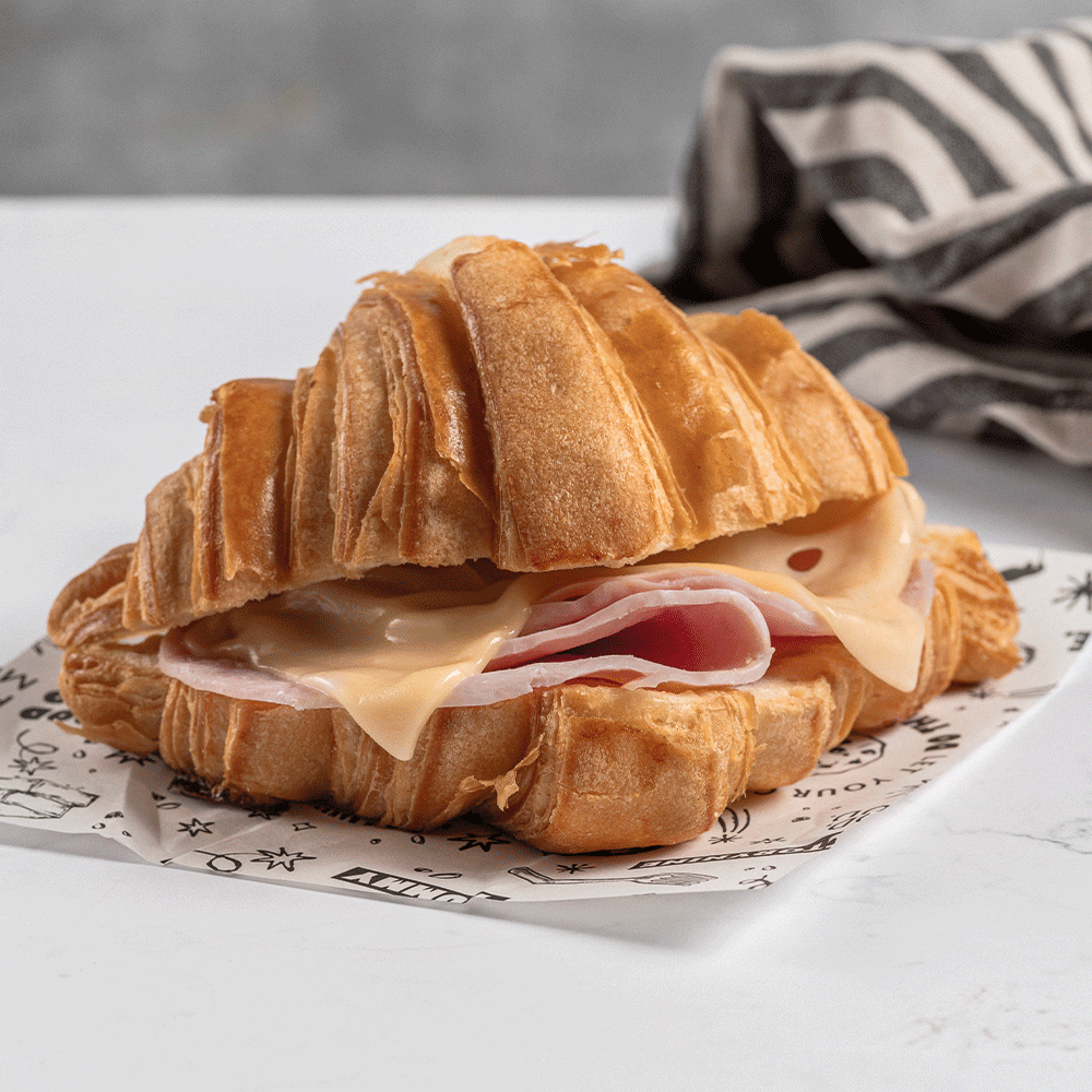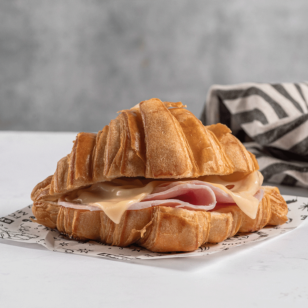 Tradicional croissant relleno con jamón y queso gauda fundido.