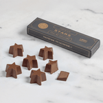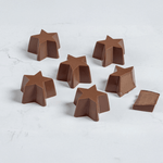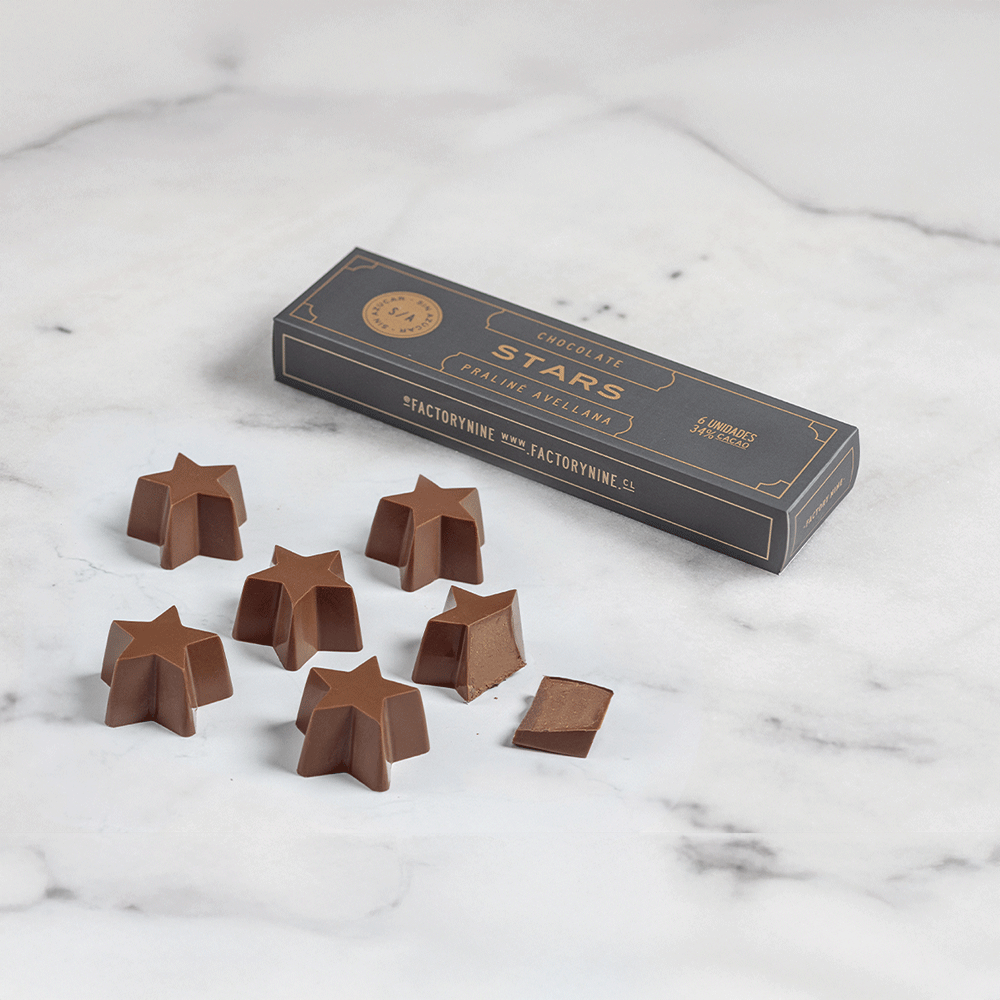 6 Bombones en forma de estrella de chocolate de leche 34% de cacao sin azúcar, relleno de pasta de praliné y avellana sin azúcar.